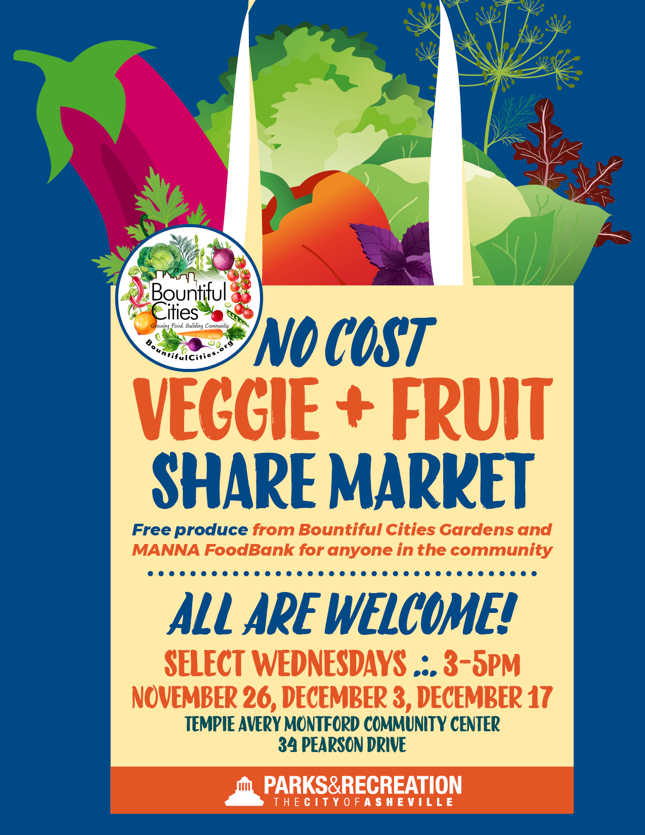 Now through November 25, 2025. Donate shelf‑stable foods at any of the 12 Buncombe County library branches during open hours. Additional sites: HHS (40 Coxe Ave.), Register of Deeds (205 College St.), Lake Julian Park; plus City of Asheville locations at Tempie Avery Montford, Harvest House, Grove St., and Stephens‑Lee community centers.