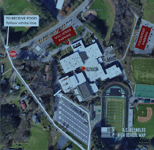 Volunteer arrive at 7:30am to AC Reynolds High School. Food is distributed from 8:30am-10:00am.